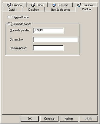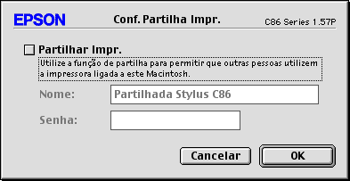 Seleccione a caixa de verificação Partilhar Impr. e, em seguida, escreva o nome da impressora e a palavra-passe, conforme necessário.