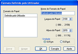 Para apagar um formato de papel personalizado da lista, abra a caixa de diálogo relativa ao formato de papel personalizado e seleccione o nome do formato personalizado que pretende apagar. Em seguida, faça clique em Apagar.