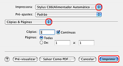 Seleccione Stylus C86 (Alimentador - Sem margens) para a definição de impressão e, em seguida, efectue as definições Cópias & Páginas.