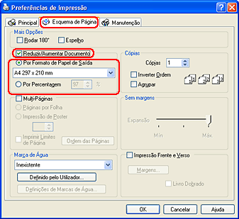 Faça clique no separador Esquema de Página e, em seguida, seleccione a caixa de verificação Reduzir/Aumentar Documento. Pode seleccionar as definições apresentadas em seguida para alterar o formato do documento.