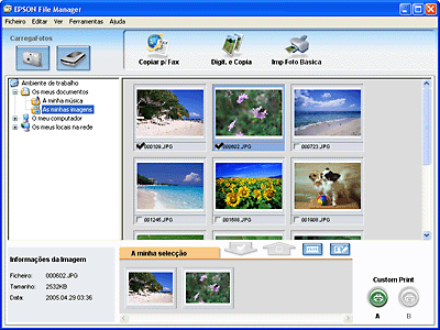 Faça clique em Iniciar e seleccione Todos os Programas (Windows XP x64 e XP) ou Programas (Windows Me, 98 SE e 2000). Em seguida, seleccione EPSON Creativity Suite, File Manager e faça clique em EPSON File Manager.
