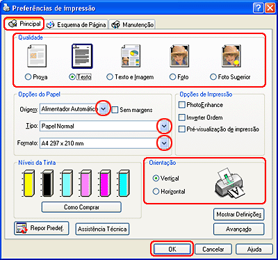 Faça clique em OK para fechar a janela de definições da impressora.