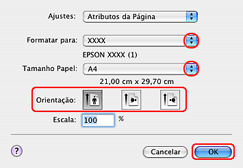 Seleccione a definição Formato (Size) adequada. Pode também definir um formato de papel personalizado. Para mais informações, consulte a ajuda interactiva.
