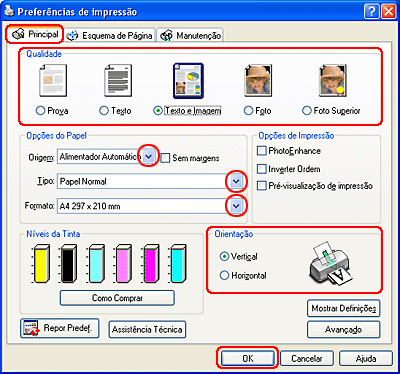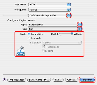 Seleccione as definições Papel, Cor e Modo adequadas. Para mais informações sobre as Definições de Impressão, consulte a ajuda interactiva.