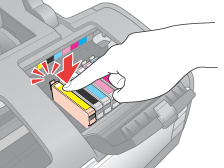 Certifique-se de que a tampa do compartimento dos tinteiros está bem fechada. Em primeiro lugar, pressione duas ou mais vezes a tecla da tinta até que o carreto se desloque para a posição de substituição dos tinteiros; em seguida, abra a tampa do compartimento dos tinteiros e exerça pressão sobre os mesmos até os encaixar. Feche a tampa do compartimento dos tinteiros e pressione a tecla da tinta .