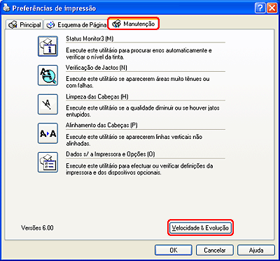 Pode aumentar a velocidade de impressão se seleccionar determinadas definições na janela Velocidade & Evolução (Speed & Progress). Faça clique na tecla Velocidade & Evolução na janela Manutenção (Maintenance) do controlador de impressão.