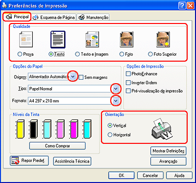 Seleccione Vertical (altura) ou Horizontal (largura) para alterar a orientação da impressão.