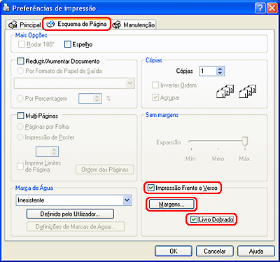 Faça clique no separador Esquema de Página e, em seguida, seleccione a caixa de verificação Impressão Frente e Verso.