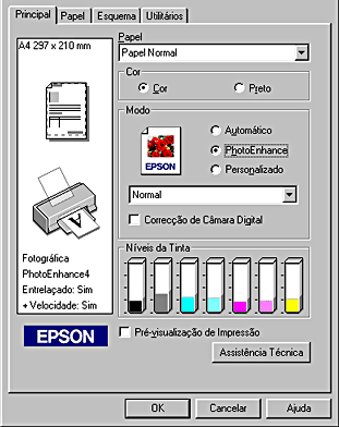 | Quando instalar um tinteiro preto fotográfico e definir Cor para Preto, o tinteiro preto fotográfico só é utilizado quando imprimir em papel normal. Quando imprimir noutros papéis, o preto é criado através da combinação de outras cores. |