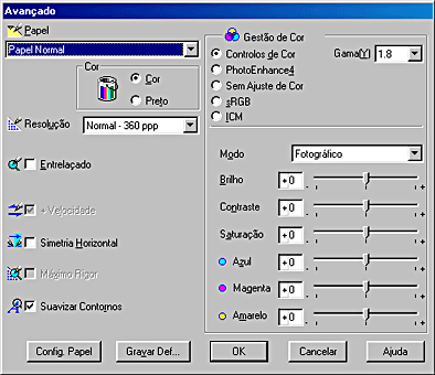 | Os ecrãs do controlador de impressão apresentados nesta secção são os do Windows 98 e 95. Os ecrãs do controlador de impressão do Windows XP, Me, NT 4.0 e 2000 têm um aspecto ligeiramente diferente. |