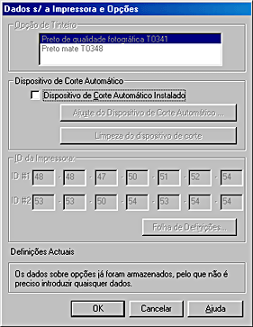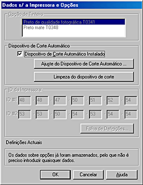 Dependendo da configuração do sistema, as informações mostradas na caixa de diálogo Dados s/ a Impressora e Opções podem ser actualizadas automaticamente ou podem ser introduzidas manualmente.