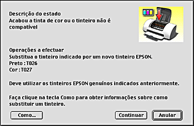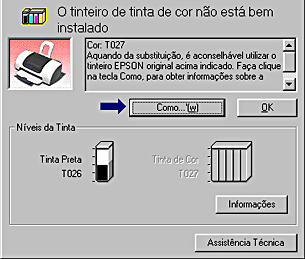 Quando a tinta acabar ou houver pouca tinta, aparecerá a tecla Como. Faça clique em Como para que o EPSON Status Monitor o oriente no processo de substituição dos tinteiros.