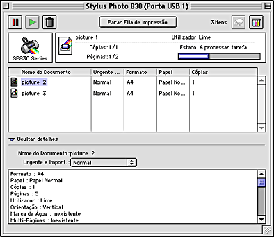 Depois de enviar uma tarefa de impressão para a impressora, pode executar o utilitário EPSON Monitor3 para verificar, cancelar ou alterar a prioridade das tarefas de impressão que estão na fila de espera. Este utilitário apresenta também o estado da tarefa de impressão em curso.