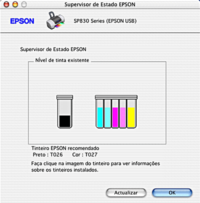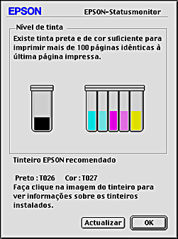Este utilitário permite também verificar os níveis de tinta antes da impressão. O EPSON StatusMonitor apresenta a quantidade de tinta existente na altura em que foi aberto. Para actualizar as informações relativas ao nível de tinta, faça clique em Actualizar.