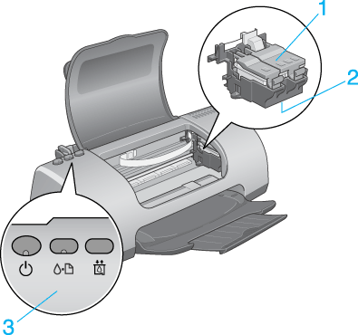 1. Tampas dos compartimentos dos tinteiros: Mantêm os tinteiros na posição correcta. Abra-as apenas quando instalar ou substituir tinteiros.
