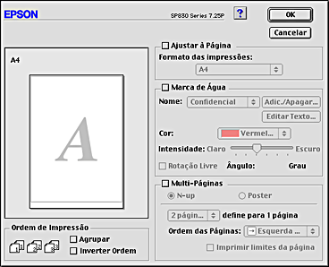 Seleccione a marca de água que pretende imprimir na lista Nome e, em seguida, especifique a sua posição, tamanho, cor e intensidade. Pode alterar a posição e o tamanho da marca de água, arrastando-a com o rato na janela de pré-visualização apresentada do lado esquerdo.