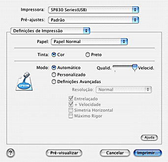 Quando selecciona o modo Automático na caixa de diálogo Imprimir, com a opção Definições de Impressão seleccionada, o software da impressora efectua todas as definições detalhadas com base nas definições de tipo de papel e tinta seleccionadas. Para definir a tinta, consulte Definir a tinta. Para definir o tipo de papel, consulte Definir o tipo de papel.