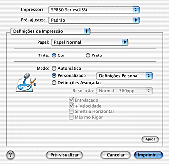 Ao seleccionar o modo Personalizado, activa a lista de definições personalizadas, onde pode seleccionar uma definição especialmente criada para imprimir texto e gráficos. Pode também seleccionar o método de correspondência de cores ColorSync. Pode ainda criar e guardar as suas definições personalizadas. Para mais informações sobre como efectuar definições personalizadas, consulte Utilizar o modo de definições avançadas.