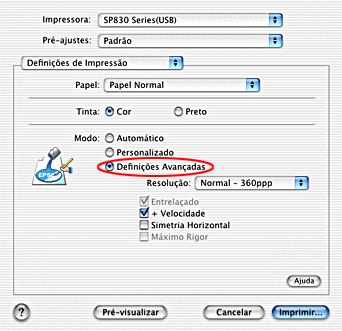 Este modo permite-lhe efectuar definições de impressão mais detalhadas. Para obter mais informações, consulte Utilizar o modo de definições avançadas. |