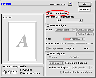 Pode imprimir com a função Ajustar à Página para ajustar a impressão ao formato de papel que seleccionou na lista de formatos de papel situada no menu Papel.