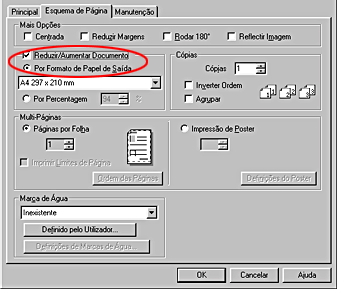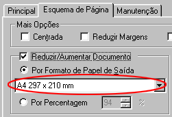 No menu de esquema de página (Windows), seleccione a caixa de verificação que permite reduzir e aumentar os documentos e seleccione a opção relativa ao formato de papel de saída.