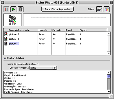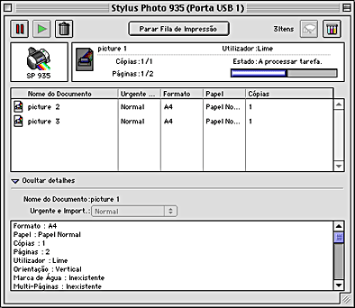 Depois de enviar uma tarefa de impressão para a impressora, pode executar o utilitário EPSON MonitorIV para verificar, cancelar ou alterar a prioridade das tarefas de impressão que estão na fila de espera. Este utilitário apresenta também o estado da tarefa de impressão em curso.