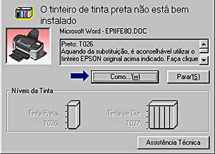 Quando a tinta acabar ou houver pouca tinta, aparece a tecla Como por baixo da caixa de texto. Faça clique em Como para que o EPSON Status Monitor 3 o oriente--no processo de substituição dos tinteiros.