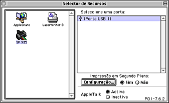 Seleccione Selector de Recursos a partir do menu da maçã, faça clique no ícone da impressora e, em seguida, seleccione a porta à qual a impressora está ligada.