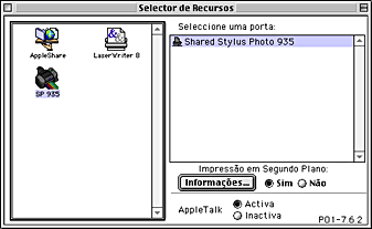 Seleccione Selector de Recursos no menu da maçã. Faça clique no ícone da impressora adequada e seleccione a porta da impressora pretendida na lista Seleccione uma porta.