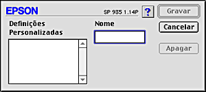 Para gravar as Definições Avançadas na lista Definições Personalizadas, faça clique em Gravar Def. na caixa de diálogo Avançado. Aparece a caixa de diálogo Definições Personalizadas.
