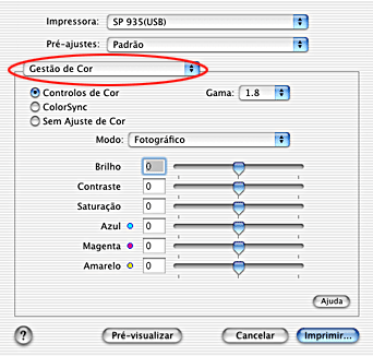Seleccione a opção Gestão de Cor a partir do menu emergente para controlar a correspondência de cores e os métodos de ajuste incluídos no controlador de impressão. Siga as instruções apresentadas em seguida.