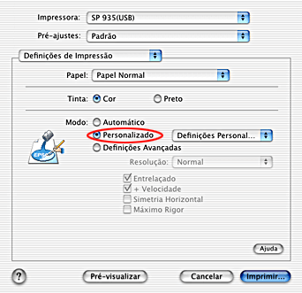 Ao seleccionar o modo Personalizado activa a lista de definições personalizadas, onde pode seleccionar uma definição especialmente criada para imprimir texto e gráficos. Pode também seleccionar o método de correspondência de cores ColorSync. Pode ainda criar e guardar as suas definições personalizadas. Para mais informações sobre como efectuar definições personalizadas, consulte Utilizar o modo de Definições Avançadas.