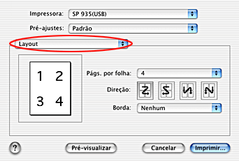 Para imprimir várias páginas do documento numa folha de papel, seleccione a opção Layout para a definição Multi-Páginas no menu emergente.