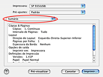Com a opção Sumário seleccionada, pode confirmar as definições actuais na caixa de diálogo Imprimir.