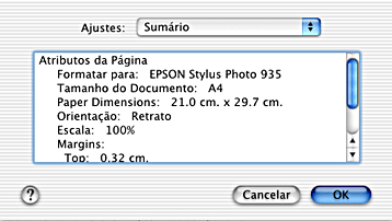 Com a opção Sumário seleccionada na lista de ajustes, pode confirmar as definições actuais na caixa de diálogo Configurar Página.