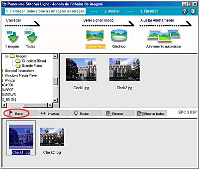 Se nenhuma imagem estiver definida como imagem-base quando tiverem sido carregadas duas imagens, a imagem situada do lado esquerdo na caixa de selecção de ficheiros é assumida como sendo a imagem-base; quando tiverem sido carregadas três ou mais imagens, a imagem situada no centro após a união é assumida como imagem-base.