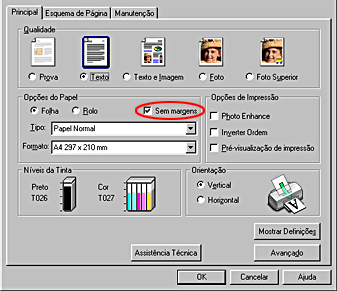 Depois de colocar papel na impressora, altere as definições do controlador de impressão para a opção sem margens.