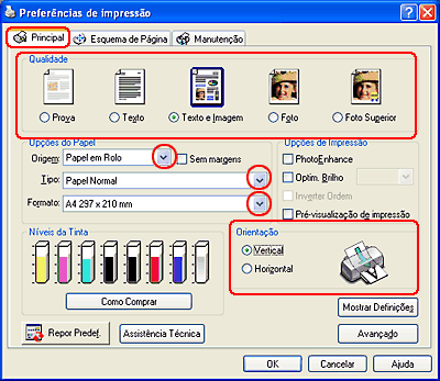 Seleccione Vertical (altura) ou Horizontal (largura) para alterar a orientação da impressão.