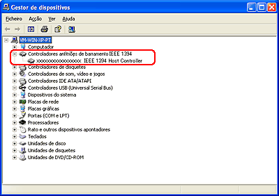 ![]() | Faça clique na opção de controladores principais IEEE 1394 Bus e verifique se aparece a identificação do item IEEE 1394 Host Controller. Se aparecer a identificação deste item, isso significa que o sistema operativo Windows que está a utilizar suporta IEEE 1394 compatível com OHCI. |