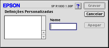 Escreva um nome para as definições na caixa de texto Nome e, em seguida, faça clique em Gravar. O nome pode conter até 16 letras e números. Pode também utilizar até oitos caracteres de duplo byte; no entanto, estes podem não ser correctamente visualizados no ecrã, consoante as definições do sistema operativo que estiver a utilizar. As definições personalizadas serão adicionadas à lista Definições Personalizadas e serão seleccionadas as definições personalizadas mais recentes. Pode guardar até 100 definições personalizadas.