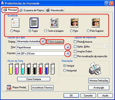 Depois de colocar papel na impressora, altere as definições do controlador de impressão para a opção de impressão sem margens.