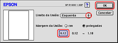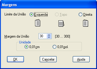 Seleccione a unidade de medida (cm ou polegadas). Em seguida, especifique a largura da margem de união. Pode definir um valor compreendido entre 0,3 e 3,0 cm ou entre 0,12 e 1,18 polegadas.