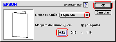 Especifique a largura da margem de união na caixa de texto. Pode definir um valor compreendido entre 0,12 e 1,18 polegadas ou entre 0,3 a 3 cm. Essa largura de margem será utilizada em ambos os lados da dobra. Por exemplo, se especificar um valor de 10 mm, será inserida uma margem de 20 mm (10 mm de cada lado da dobra).
