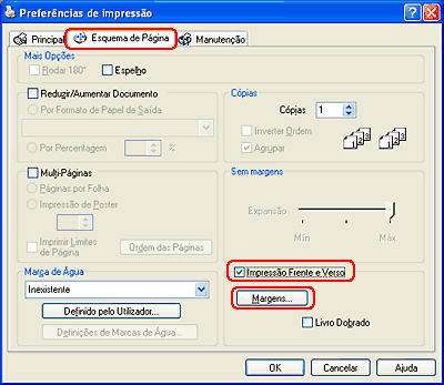 Faça clique no separador Esquema de Página e, em seguida, seleccione a caixa de verificação Impressão frente e verso.