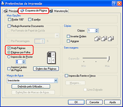 Imprime várias páginas do documento numa folha de papel. Pode seleccionar 1, 2, 4, 6, 9 ou 16. |