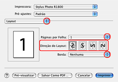 ![]() | Seleccione Stylus Photo R1800 para a definição Impressora e, em seguida, efectue as definições Cópias & Páginas. |