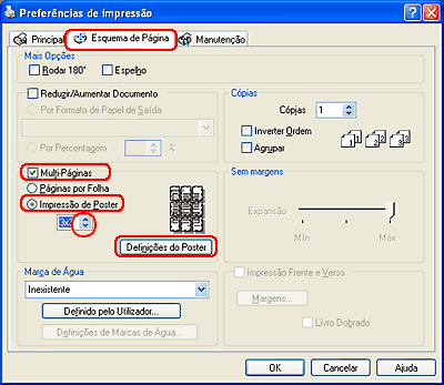 Faça clique no separador Esquema de Página, seleccione Multi-Páginas e, em seguida, seleccione Impressão de Poster. Faça clique na seta para cima ou para baixo para seleccionar 2x2, 3x3 ou 4x4.