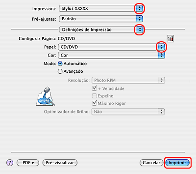 Quando imprimir num CD/DVD, será utilizado um nível de saturação de cor mais baixo relativamente ao papel especial Epson, de forma a garantir a qualidade de impressão.