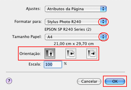 Seleccione as definições Formato do Papel e Orientação adequadas. Pode também definir um formato de papel personalizado. Para mais informações, consulte a ajuda interactiva.
