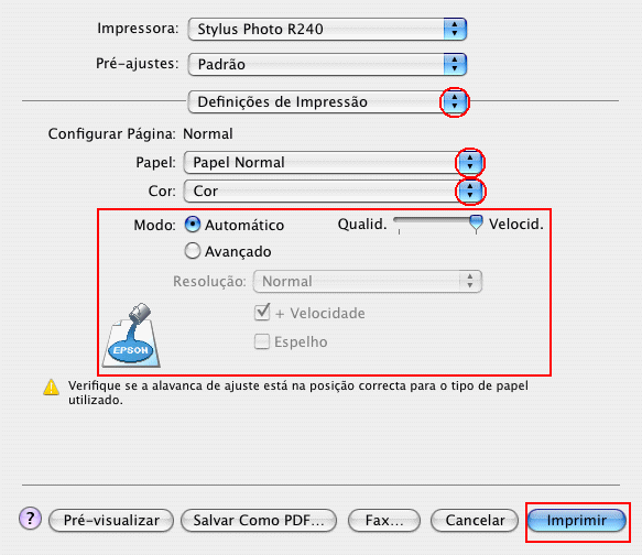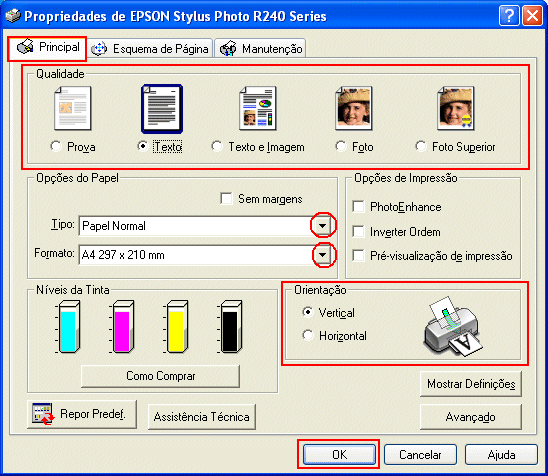 Seleccione as definições Papel, Tinta e Modo adequadas. Para mais informações sobre Definições de Impressão , consulte a ajuda interactiva.